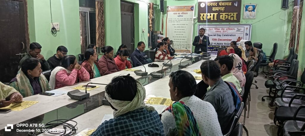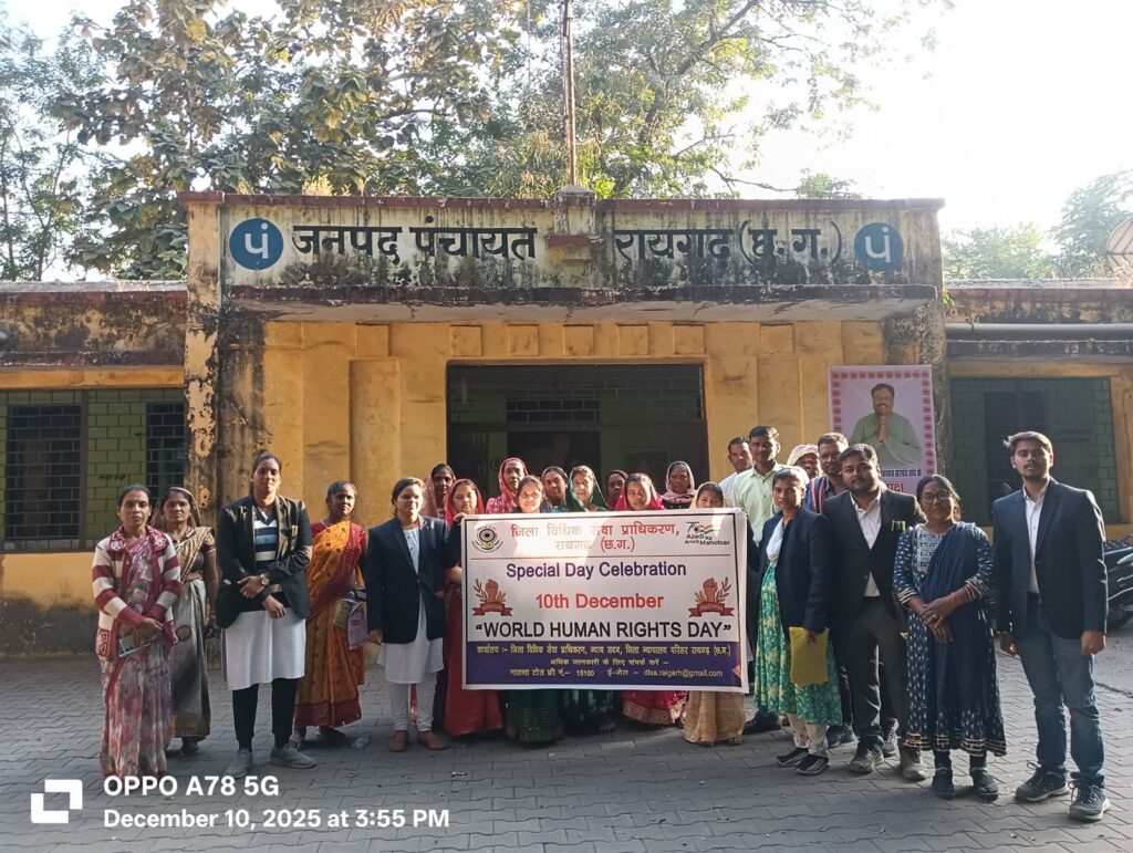 रायगढ़, 11 दिसम्बर 2025/ राष्ट्रीय विधिक सेवा प्राधिकरण नई दिल्ली एवं छ.ग. राज्य विधिक सेवा प्राधिकरण बिलासपुर के निर्देशन में प्रधान जिला न्यायाधीश एवं अध्यक्ष श्री जितेन्द्र कुमार जैन के मार्गदर्शन तथा जिला विधिक सेवा प्राधिकरण रायगढ़ न्यायाधीश/सचिव श्रीमती अंकिता मुदलियार के नेतृत्व में विश्व मानव अधिकार दिवस के अवसर पर जनपद पंचायत रायगढ़ में विधिक जागरूकता शिविर का आयोजन किया गया।