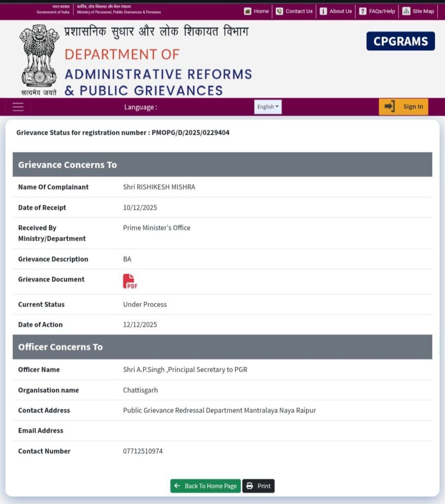 *अब PMO करेगा फैसला: शिकायत ‘Under Process’ :* स्थानीय प्रशासन और कलेक्टर की चुप्पी के बाद, ऋषिकेश मिश्रा ने 6 दिसंबर 2025 को प्रधानमंत्री कार्यालय (PMO) में शिकायत दर्ज कराई।