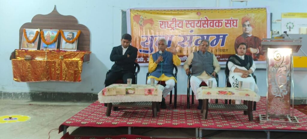 मुख्य वक्ता शिवराम समदरिया जी ने कहा ; “संघ में वही नि:स्वार्थ व्यक्ति कार्य कर सकता है , जिसका ध्येय देश व धर्म की सेवा करना हो । देश की सेवा करने एवं देश को परम वैभव के शिखर में पहुंचाने हेतु युवाओं की भूमिका महत्वपूर्ण है । संघ का कार्य धार्मिक एवं सांस्कृतिक क्षेत्रों में अधिक देखने को मिलता है , क्योंकि सेवा संघ के मूलभूत कार्यों में से एक है । आज जो क्षेत्रवाद की समस्या देश में बनी हुई है , उसका निवारण संघ की विचारधारा से संभव है… क्योंकि संघ भाषावाद , क्षेत्रवाद से ऊपर उठकर है ।” मुख्य अतिथि प्रांजल मिश्रा जी ने कहा ; “युवाओं को अपनी भागीदारी की याचना करने की आवश्यकता नहीं है अपितु सामने आकर कार्य करने की है , युवा स्वयं में सक्षम है जिससे वह किसी भी क्षेत्र में नेतृत्व करने की क्षमता रखता है । आज के युवाओं को अपने एवं देश के भविष्य की चिंता करते हुए कोई भी कार्य करना चाहिए , युवा को ईमानदारी का मूल मंत्र लेकर आगे बढ़ना चाहिए । संघ आज हर क्षेत्र में कार्य कर रहा है , जिससे समाज सुरक्षित रह सके एवं देश की आंतरिक व्यवस्था सुदृढ़ रहे । हम सभी को भी दृढ़ संकल्पित होकर अपने व्यस्त जीवन से देश सेवा के लिए समय निकालना चाहिए ताकि हमारा भविष्य सुरक्षित रहे ।”