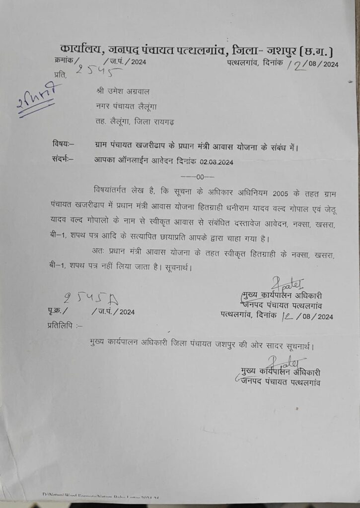 इस पूरे मामले में सबसे चौंकाने वाला खुलासा तब हुआ, जब सूचना के अधिकार अधिनियम के तहत जनपद पंचायत पत्थलगांव से पीएम आवास योजना से संबंधित दस्तावेज मांगे गए। नक्शा, खसरा, बी-1 और शपथ पत्र जैसी महत्वपूर्ण जमीन संबंधी जानकारियों की सत्यापित प्रतियां मांगी गई थीं, लेकिन जनपद पंचायत ने दिनांक 12 अगस्त 2024 को लिखित जवाब देते हुए साफ कहा कि प्रधानमंत्री आवास योजना में हितग्राही से भूमि संबंधी दस्तावेज लिए ही नहीं जाते।