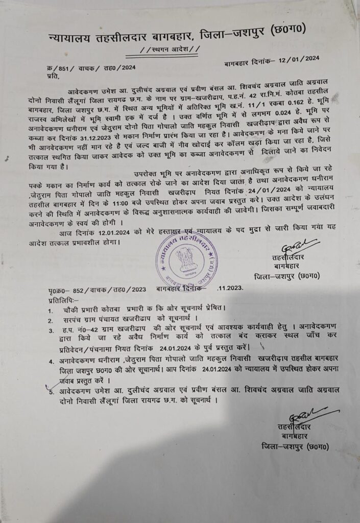 प्राप्त जानकारी के अनुसार, जिस भूमि पर पीएम आवास का निर्माण किया जा रहा है, वह भूमि किसी अन्य व्यक्ति की निजी संपत्ति है। इस मामले को लेकर तहसीलदार न्यायालय बागबहार द्वारा पहले ही दिनांक 12 जनवरी 2024 को स्थगन आदेश जारी किया गया था। इसके बावजूद जब निर्माण नहीं रुका, तो न्यायालय ने पुनः 12 जून 2026 को भी स्थगन आदेश जारी किया। लेकिन हैरानी की बात यह है कि दो-दो स्थगन आदेशों के बाद भी निर्माण धड़ल्ले से जारी है, जो सीधे-सीधे न्यायपालिका की अवमानना के दायरे में आता है।